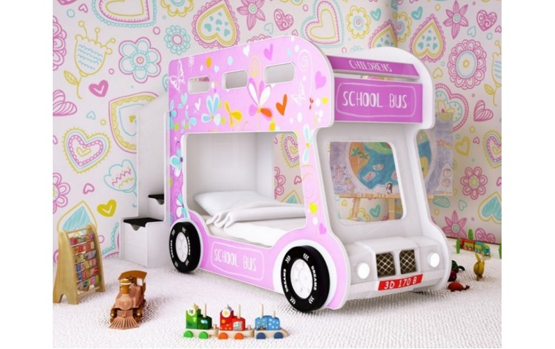 Кровать Автобус "Лето" украсит интерьер маленьких принцесс. Кровать выполнена из высококачественного ЛДСП с фотопечатью, благодаря которой рисунок не стирается. Основание кровати выполнено из натурального дерева, с эффектом ортопеда,а так же имеет 4 ящика для белья. Передняя часть изготовлена из экологически чистого пластика, со светящимися фарами, а так же в комплект входят два пластмассовых колеса. Размеры спального места составляют 1700х700 мм.