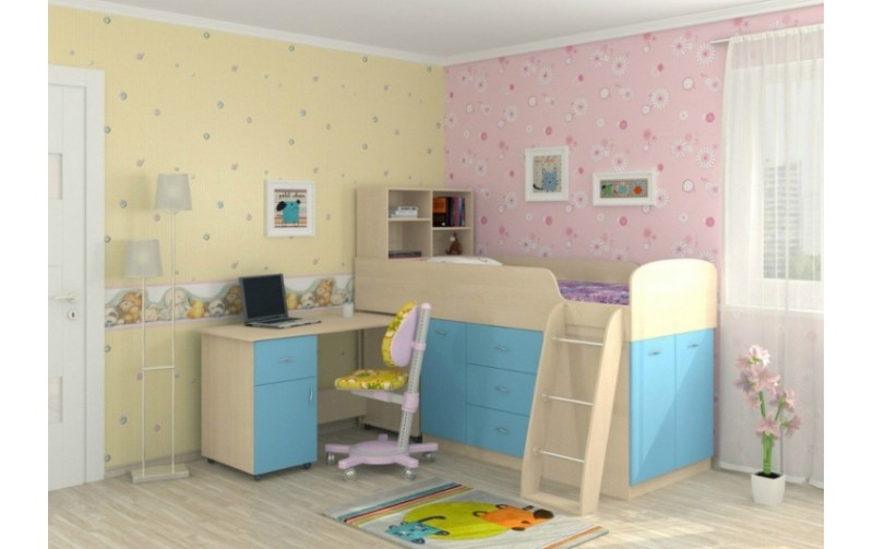 Кровать чердак Дюймовочка (Голубой+Дуб Молочный)