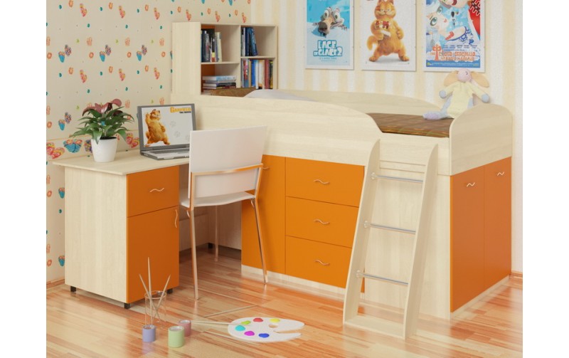 Кровать чердак Дюймовочка (Оранжевый+Дуб Молочный)