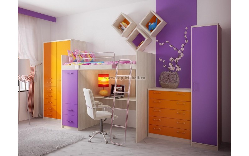 Боковины выполнены из утолщенного 25мм ЛДСП, а более простые детали - толщиной 16мм. Для безопасности установлен металлический ограничитель высотой 250мм, благодаря которому ребенок будет надежно защищен, а конструктив элемента не будет создавать ощущение замкнутого пространства. В комплект включена металлическая лестница, при необходимости ее можно исключить и дополнить композицию тумбой-лестницей. Кровать-чердак включает в себя: спальное место 1950х900 мм, двухдверный шкаф (наполнение: штанги + две полки), металлическую лестницу и письменный стол.