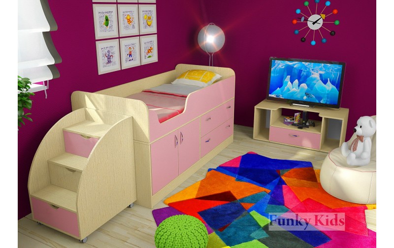 Кровать чердак с выдвижным столом Фанки Кидз-9 (Розовый+Дуб Кремона)