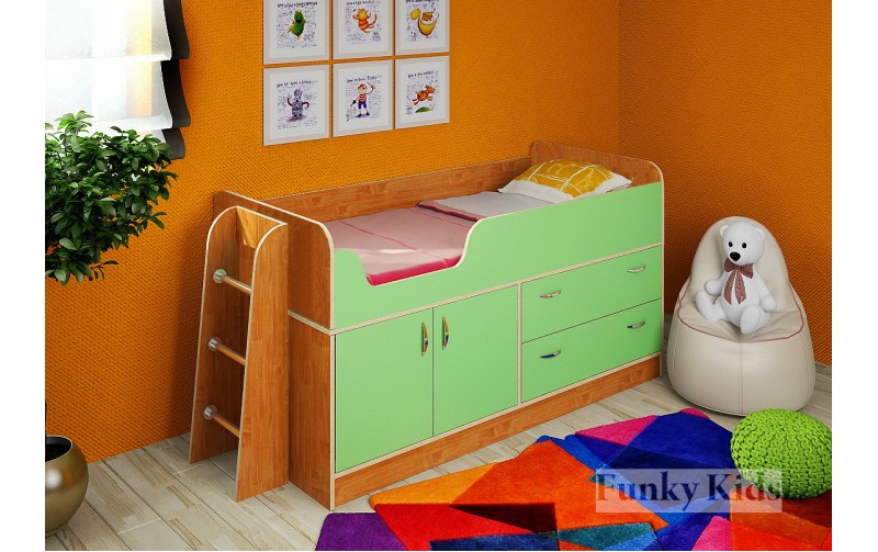 Низкая кроватка Фанки Кидз 9 со спальным местом 160х70 см. В основании ложа - лист ЛДСП, матрац приобретается дополнительно. Кроватка прекрасно подойдет для ребенка от 2-х лет. Кровать универсальна в сборке (шкаф может быть и справа и слева). В шкафу находится одна полка. Вы можете приобрести к кроватке лестницу с металлическими ступенями или тумбу лестницу, а так же другую мебель серии Фанки Кидз. Фанки-9 выполнена из высококачественной ЛДСП толщиной 16мм Эггер Австрия различных цветов. Торцевые детали покрыты светлой кромкой ПВХ. Спальное место находится на высоте 560мм. Высота бортика 250мм.