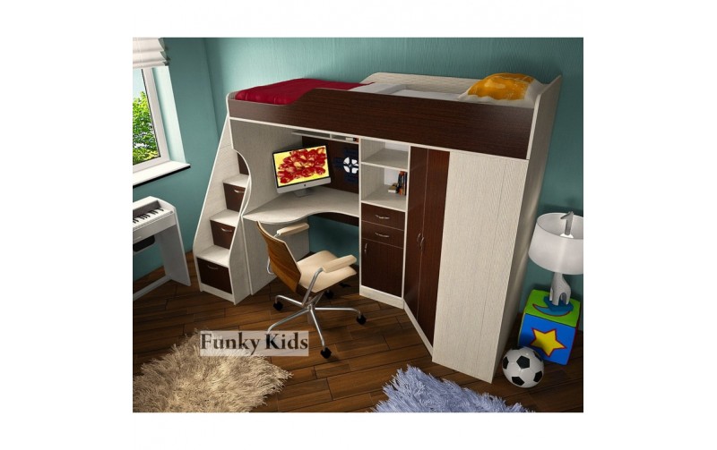 Фанки Кидз 7 - кровать чердак с рабочей зоной для детей и подростков. Отдельно можно приобрести комод с четырьмя выдвижными ящиками и другую модульную мебель. Особенности модели:
