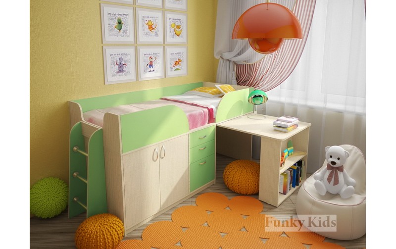 Кровать чердак с выдвижным столом Фанки Кидз-10 (Салатовый+Дуб кремона)