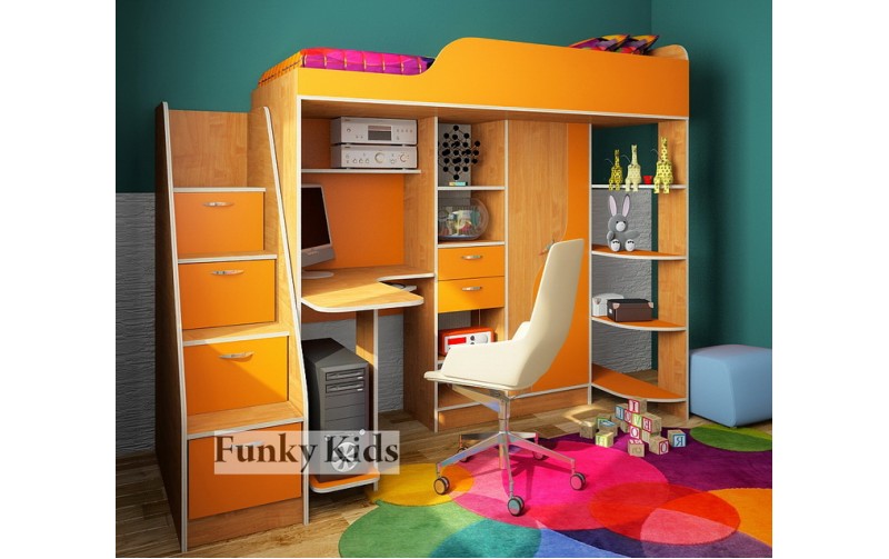 Кровать чердак с выдвижным столом Фанки Кидз-15 (Ольха+Оранжевый)