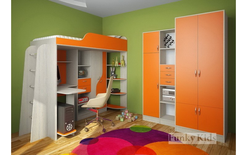 Кровать чердак с выдвижным столом Фанки Кидз-15 (Оранжевый+Сосна Лоредо)