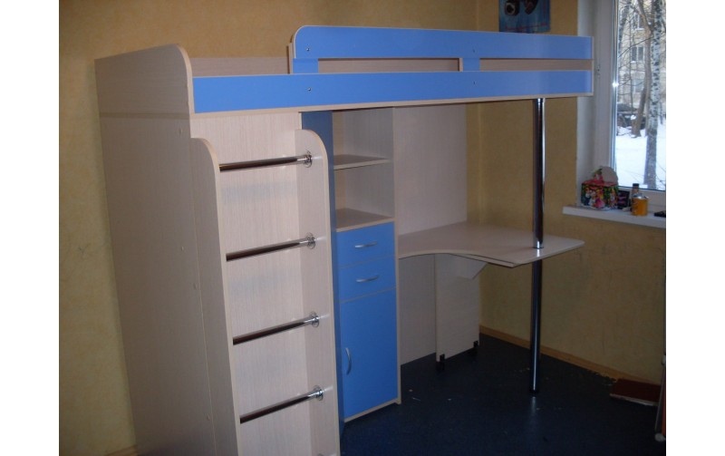 Конструкция состоит из следующих элементов конструкции: - верхнее спальное место с размером 200х80 см (матрац приобретается отдельно) с бортиком; - встроенный письменный стол с раздвижной столешницей на колесах; - вместительный двухдверный угловой шкафа для одежды (штанга и полки), со стороны которого крепится лестница с металлическими брусьями; - узкий пенал для книг (шкафчик, выдвижной ящик и полки). Цвета фасадов: ЛАЙМ, ГОЛУБОЙ, ЖЕЛТЫЙ и ДУБ КРЕМОНА. Вся конструкция Фанки Соло 3 сможет заменить Вам несколько отдельных предметов мебели, тем самым сэкономить место в детской комнате.