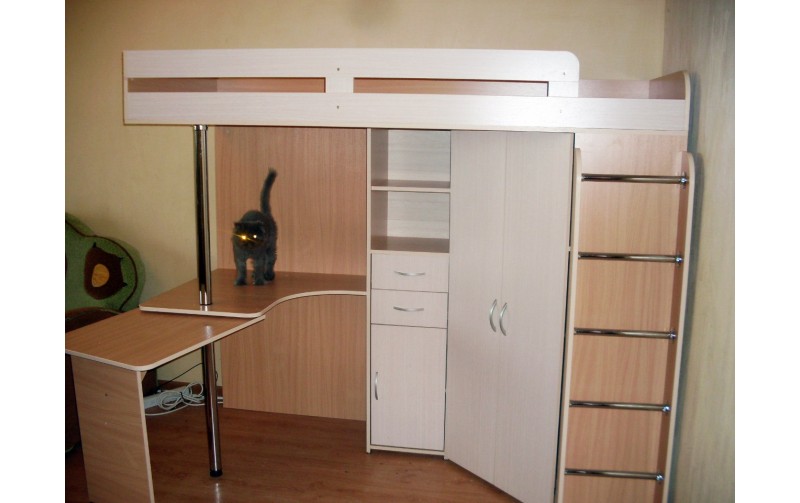 Конструкция состоит из следующих элементов конструкции: - верхнее спальное место с размером 200х80 см (матрац приобретается отдельно) с бортиком; - встроенный письменный стол с раздвижной столешницей на колесах; - вместительный двухдверный угловой шкафа для одежды (штанга и полки), со стороны которого крепится лестница с металлическими брусьями; - узкий пенал для книг (шкафчик, выдвижной ящик и полки). Цвета фасадов: ЛАЙМ, ГОЛУБОЙ, ЖЕЛТЫЙ и ДУБ КРЕМОНА. Вся конструкция Фанки Соло 3 сможет заменить Вам несколько отдельных предметов мебели, тем самым сэкономить место в детской комнате.
