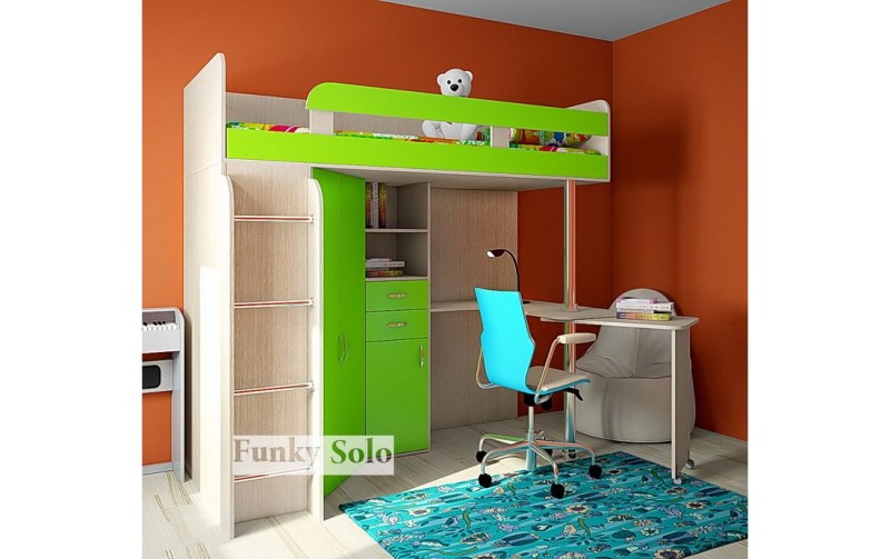 Конструкция состоит из следующих элементов конструкции: - верхнее спальное место с размером 200х80 см (матрац приобретается отдельно) с бортиком; - встроенный письменный стол с раздвижной столешницей на колесах; - вместительный двухдверный угловой шкафа для одежды (штанга и полки), со стороны которого крепится лестница с металлическими брусьями; - узкий пенал для книг (шкафчик, выдвижной ящик и полки). Цвета фасадов: ЛАЙМ, ГОЛУБОЙ, ЖЕЛТЫЙ и ДУБ КРЕМОНА. Вся конструкция Фанки Соло 3 сможет заменить Вам несколько отдельных предметов мебели, тем самым сэкономить место в детской комнате.