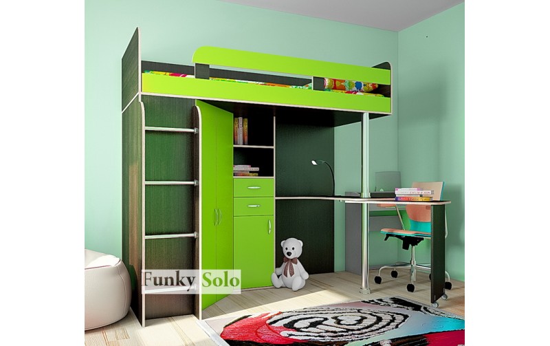 Конструкция состоит из следующих элементов конструкции: - верхнее спальное место с размером 200х80 см (матрац приобретается отдельно) с бортиком; - встроенный письменный стол с раздвижной столешницей на колесах; - вместительный двухдверный угловой шкафа для одежды (штанга и полки), со стороны которого крепится лестница с металлическими брусьями; - узкий пенал для книг (шкафчик, выдвижной ящик и полки). Цвета фасадов: ЛАЙМ, ГОЛУБОЙ, ЖЕЛТЫЙ и ДУБ КРЕМОНА. Вся конструкция Фанки Соло 3 сможет заменить Вам несколько отдельных предметов мебели, тем самым сэкономить место в детской комнате.