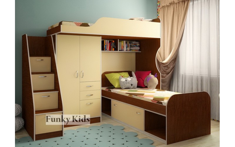 Кровать чердак Фанки Кидз 4 - это выгодный подарок для Вашего ребенка, так как он получит не только кровать, но и уголок школьника, и игровую зону - все в одном модуле. В состав кроватного блока входят шкаф гардероб с ящиками, внутри штанга для вешалок и полки. В основании спального места лист ДСП, размер 190х80см. Высокие бортики царги оберегают Вашего ребенка от падений во время сна. Под ложе располагается рабочее пространство: письменный стол со встроенной тумбочкой под столешницей и специальной нишей для компьютера, удобная полка выдвижная для клавиатуры и мышки.  К постели на верхний этаж ведет приставная лестнца комод 13/8 СВ, которая насчитывает четыре ступеньки, три из которых, выдвигаются и служат роль ящиков для детских вещей или игрушек.