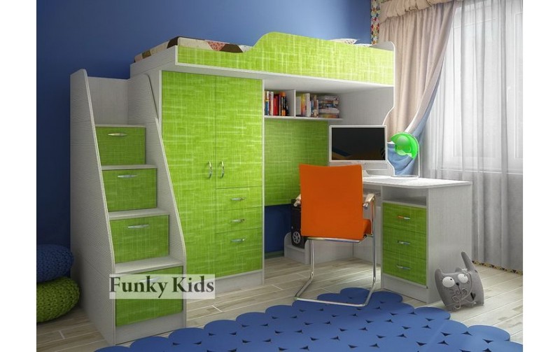 Кровать чердак Фанки Кидз 4 - это выгодный подарок для Вашего ребенка, так как он получит не только кровать, но и уголок школьника, и игровую зону - все в одном модуле. В состав кроватного блока входят шкаф гардероб с ящиками, внутри штанга для вешалок и полки. В основании спального места лист ДСП, размер 190х80см. Высокие бортики царги оберегают Вашего ребенка от падений во время сна. Под ложе располагается рабочее пространство: письменный стол со встроенной тумбочкой под столешницей и специальной нишей для компьютера, удобная полка выдвижная для клавиатуры и мышки.  К постели на верхний этаж ведет приставная лестнца комод 13/8 СВ, которая насчитывает четыре ступеньки, три из которых, выдвигаются и служат роль ящиков для детских вещей или игрушек.