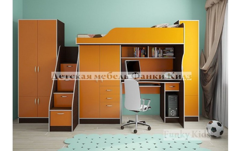 Кровать чердак с выдвижным столом Фанки Кидз-4 (Оранжевый+Венге)