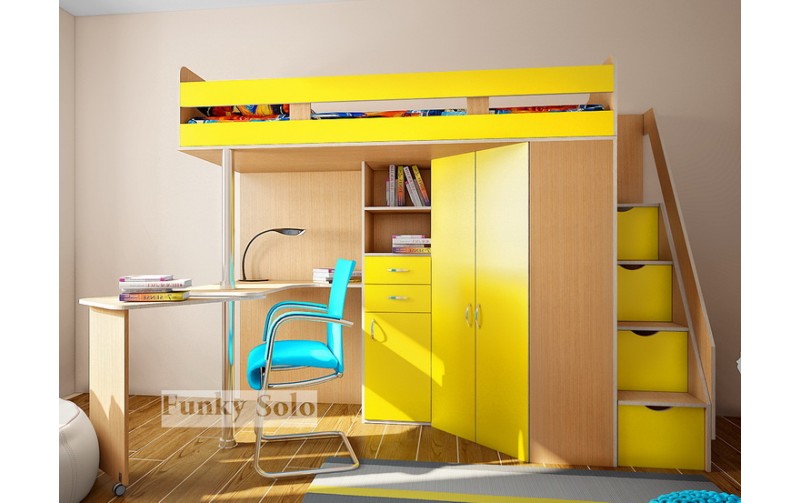 Фанки Соло 1 - это вместительное спальное место с бортиком-ограничителем, матрац приобретается отдельно; - это устойчивая и прочная тумба-лестница с двумя нижними выдвижными ящиками; - это встроенный шкаф с полками и штангой для одежды; - это письменный стол с дополнительной выкатной столешницей на колесах, а металлическая штанга не будет препятствовать поступлению света на рабочую зону ребенка; - это узкий встроенный пенал с ящиками и открытыми полками для книг и школьных принадлежностей.