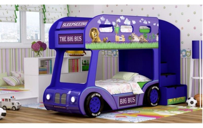 Кровать Автобус Мадагаскар Люкс (Синий) изготовлена для двоих малышей. Изделие имеет два яруса, с пластиковой передней частью и светящимися фарами. Основание кровати изготовлено из деревянных ламелей с ортопедическим эффектом. Изделие оснащено подъемными механизмами и четырьмя ящиками для белья. Кровать комплектована двумя накладными колесами. Размер спального места 1700х700 мм.