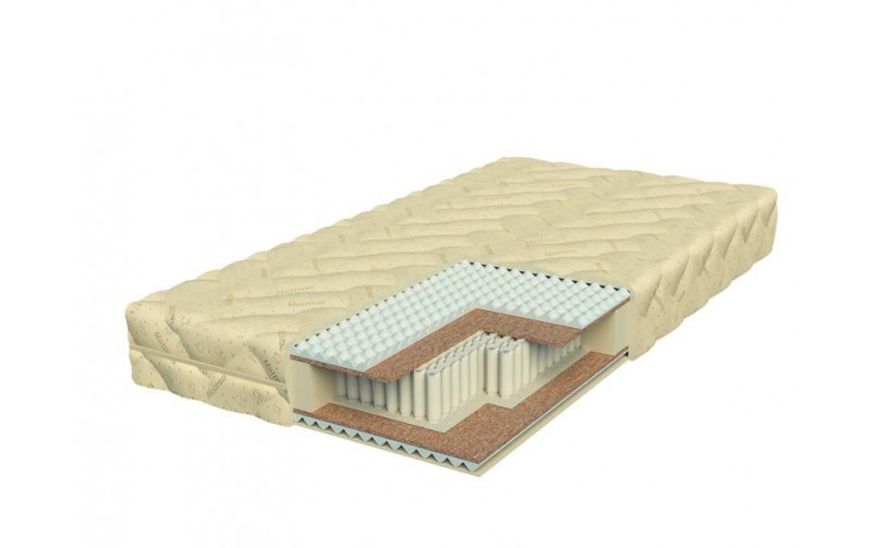 Изделие имеет одинаковый состав снизу и сверху изделия. С двух сторон на пружинный блок накладывается нетканое полотно. После идет слой биококоса высотой в 1 см, и сверху на него накладывается пенополиуретанновый материал с рельефом (за счёт использования ППУ, компания может снизить цену на изделия). Также он гипоаллергенен, не вызывает и не впитывает неприятные запахи. Чехол выполнен из велюра, на ощупь он очень приятный, имеющий дышащие свойства, отлично проветривается, не мнется и не вытягивается. Высота данного матраса составляет 23-24 см, максимальный вес на одно спальное место 120 кг, а разница в весе спящих людей более 25 кг.