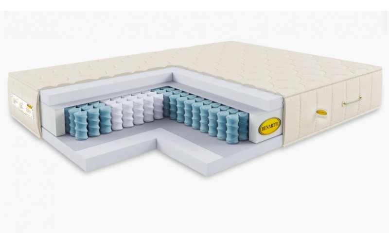 Матрас Ортопедический с блоком независимых пружин Benartti Classic Mega TFK имеет среднюю жесткость. Верхний и нижний слои изготовлены из искусственного латекса толщиной 6 см. Внутри расположен пружинный блок из 256 пр./м2. Между слоями и пружинным блоком расположены изоляционные слои спанбонда, Общая высота изделия составляет 26 см, а максимальная нагрузка на спальное место 140 кг. Чехол изготовлен из хлопкового жаккарда, на молнии, стеган синтепоном. Матрас оснащен четырьмя ручками для переворачивания, а так же аэраторами для лучшей вентиляции слоев. Матрас изготовлен из гипоаллергенных дышащих материалов. При правильном уходе и использовании матрас прослужит более 25 лет.