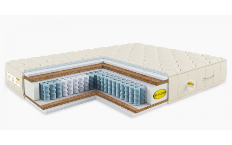 Матрас Ортопедический с блоком независимых пружин Benartti Optimal Max Duo S1000, верхний слой которого умеренно жесткий изготовлен из искусственного латекса, толщиной 2 см, затем следует слой из кокосовой койры. Нижний слой средней жесткости изготовлен из натурального латекса, толщиной 3 см и кокосовой койры (2 см). Внутри расположен пружинный блок из 1000 пр./м2. Между слоями и пружинным блоком расположены изоляционные слои спанбонда, Общая высота изделия составляет 27 см, а максимальная нагрузка на спальное место 160 кг. Чехол изготовлен из хлопкового жаккарда, на молнии, стеган синтепоном. Матрас оснащен четырьмя ручками для переворачивания, а так же аэраторами для лучшей вентиляции слоев. Матрас изготовлен из гипоаллергенных дышащих материалов. При правильном уходе и использовании матрас прослужит более 25 лет.