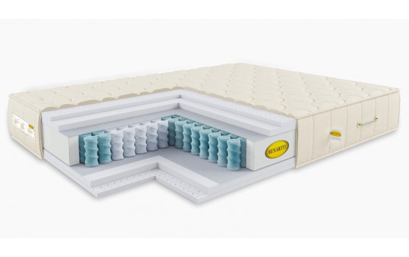 Матрас Ортопедический с блоком независимых пружин Benartti Prime Comfort TFK умеренно мягкий. Верхний и нижний слои изготовлены из натурального латекса, затем следуют слои из искусственного латекса, толщиной 2 см. Внутри расположен пружинный блок из 512 пр./м2. Между слоями и пружинным блоком расположены изоляционные слои из спанбонда, Общая высота изделия составляет 25 см, а максимальная нагрузка на спальное место 120 кг. Чехол изготовлен из хлопкового жаккарда, на молнии, стеган синтепоном. Матрас оснащен четырьмя ручками для переворачивания, а так же аэраторами для лучшей вентиляции слоев. Матрас изготовлен из гипоаллергенных дышащих материалов. При правильном уходе и использовании матрас прослужит более 25 лет.