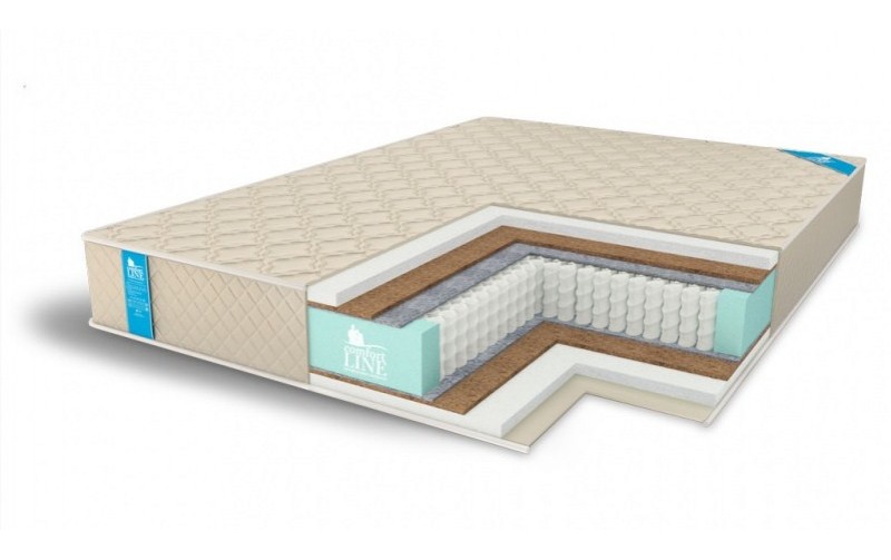 Матрас Ортопедический с блоком независимых пружин Comfort Line Hollo Hard TFK умеренно жесткий. Верхний и нижний слои изготовлены из холлкона, толщиной 3 см, который придает изделию упругость и дополнительный комфорт. Далее следуют слои из кокосовой койры, толщиной 1 см, придающие изделию жесткость и прочность. В середине изделия расположен пружинный блок из 512 пр/м кв., высотой 14 см. Между слоями и пружинным блоком расположены изоляционные слои войлока, Общая высота изделия составляет 23 см, а максимальная нагрузка на спальное место 130 кг. Чехол изготовлен из хлопкового жаккарда, на молнии, стеган синтепоном. Матрас изготовлен из гипоаллергенных дышащих материалов. При правильном уходе и использовании матрас прослужит более 25 лет.
