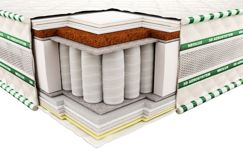Матрас Ортопедический с блоком независимых пружин Neolux 3D Магнат Ультра-кокос двусторонний. Верхний слой выполнен из ППУ с массажным эффектом, толщиной 1,5 см. ППУ запоминает и принимает форму вашего тела, делая изделие более мягким и упругим. Нижний слой жесткий, изготовлен из кокосовой койры, придающей жесткость и прочность матрасу. В середине изделия расположен пружинный блок (256 пр/м кв). Общая высота составляет 21 см. Рекомендуемая нагрузка на спальное место до 110 кг. Чехол изготовлен из хлопкового жаккарда, на молнии, стеган синтепоном. Матрас изготовлен из гипоаллергенных дышащих материалов. При правильном уходе и использовании матрас прослужит более 25 лет.