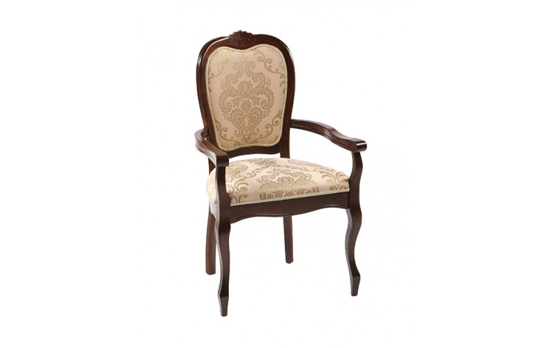 Эта модель кресла была произведена в Малайзии. Каркас и ножки выполнены из массива гевеи, отличающейся такими качествами как прочность, влагостойкость, морозостойкость, теплостойкость, стойкость к впитыванию запахов, стойкость к гниению, стойкость к деятельности паразитов и нетоксичность. Спинка и сидушка обиты мягкой тканью, подлокотники не содержат обивки. Высота данной модели кресла составляет 97 см, ширина – 60 см., а длина – 52 см. Вес изделия равен 8, 5 кг, объём – 0,07 м³. Цвет каркаса кресла – Tobacco (тёмный орех). При заказе кресло поставляется в двухместной коробке, то есть как минимум Вы может заказать пару кресел.