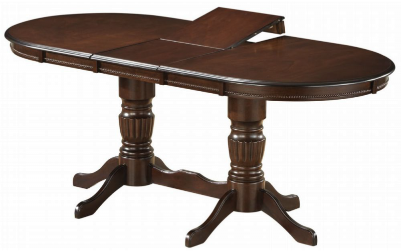 Стол овальной формы, раскладной. Столешница держится на двух достаточно массивных ножках, в виде колонн, которые к концу разделяются на три небольших ножки и имеют соединяющую их перекладину. Высота этой модели стола равна 75 см. Размер: 90 см. (ширина) на 150 см. (длина), в разобранном состоянии длина достигает 185 см. Вес изделия равен 46 кг., объём 0,28 м³. Цвет - Tobacco (тёмный орех).