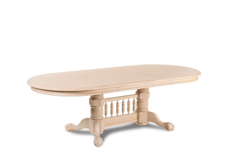Стол произведён в Малайзии и выполнен из древесины местного дерева - из массива гевеи. Эта модель имеет овальную форму, столешница держится на двух удобных ножках, которые соединяются перекладиной и разделяются книзу ещё на две ножки. Ширина стола равна 107 см., длина в сложенном состоянии - 164 см., разлаживаясь же он удлиняется до 204 см. или 240 см. Высота изделия – 77 см. Вес этой модели равен 75,25 кг., а объём – 0,41 м³. Цвет стола – чёрный антик (с патиной).