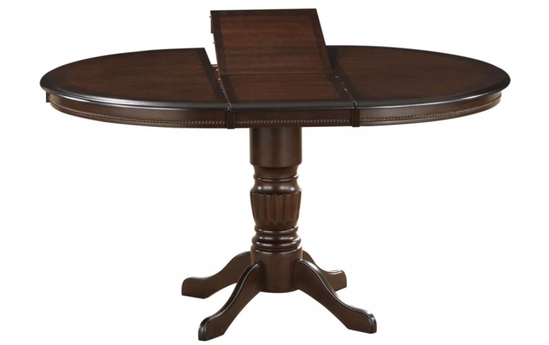 Эта модель стола имеет круглую форму и держится на одной центральной ножке, которая к концу имеет разветвления. Высота стола равна 75 см. Его ширина и длина равны по 106 см., в разобранном же состоянии его длина достигает 141 см. Вес изделия – 28,5 кг., объём - 0,17 м³. Цвет этой модели – Tobacco или, как его называют, тёмный орех.