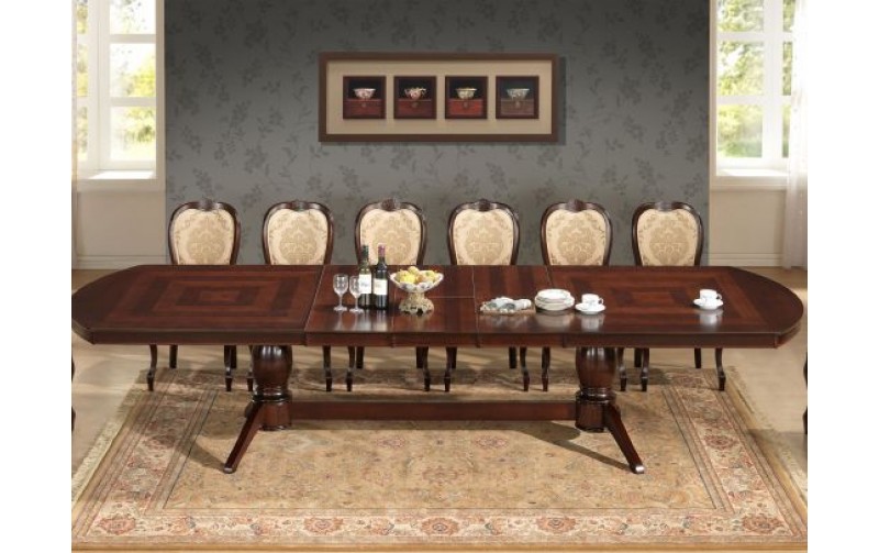 Стол имеет прямоугольную форму и основывается на двух широких ножках, соединяющихся между собой перекладиной и разделяющихся к концу ещё на две ножки. Ширина стола равна 120 см., длина составляет 241 см., он раскладной, поэтому, при раскладывании, его длина достигает 357 см. Высота изделия равна 75 см. Вес – 114, 6 кг., объём – 0,59 м³. Цвет этой модели – Tobacco (тёмный орех).