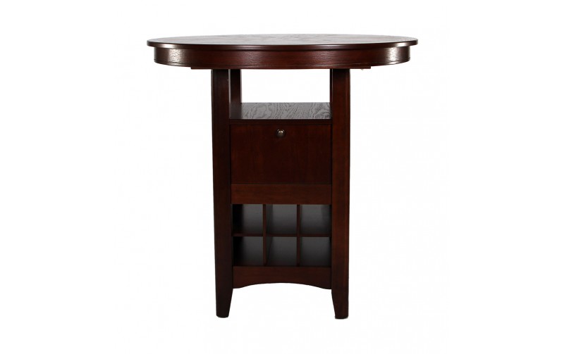 Стол сделан из МДФ и массива гевеи – дерева, которое идеально подходит для производства мебели. Оно также носит название тропического дуба. Гевея не боится влаги, не подвергается гниению и устойчиво к насекомым вредителям, благодаря чему оно невероятно надёжное. У гевеи практически не видны годовые кольца из-за жаркого климата, что придаёт её древесине эстетически привлекательный внешний вид. Стол имеет круглую форму. Высота его равна 108 см., длина и ширина по 107 см. Вес стола равен 57,3 кг, а объём 0,23 м ³. Цвет изделия - тёмный орех.