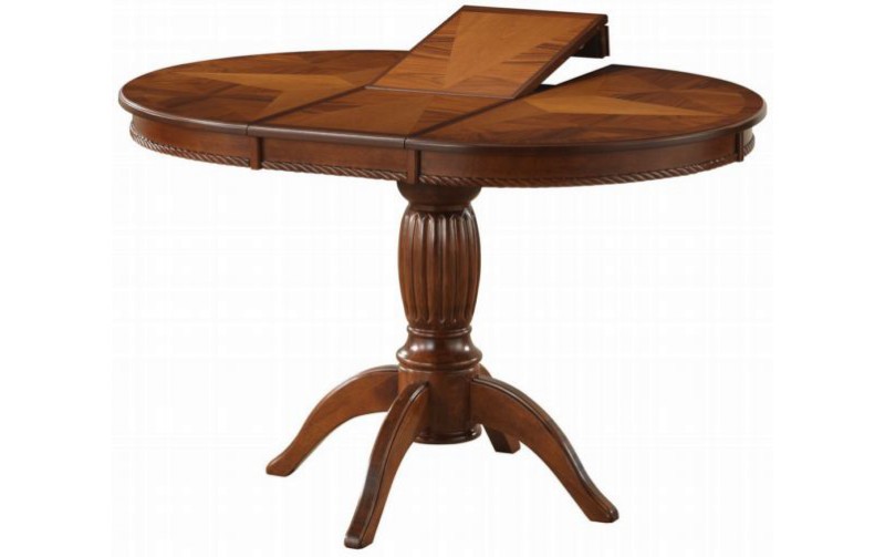 Стол имеет круглую форму и очень изящную ножку, выходящую из центра и к концу разделяющуюся на четыре небольших ножки. Стол раскладной, в обычном состоянии он имеет длину 90 см, в разложенном достигает длины 125 см., ширина его равна 90 см. Высота этой модели – 75 см. Вес изделия – 28 кг, объём – 0,17 м³, цвет Tobacco (тёмный орех).