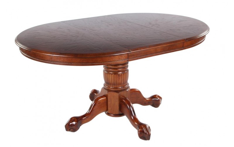 Эта модель стола имеет круглую форму и держится на одной красивой и резной ножке, которая книзу разделяется ещё на четыре ножки. Высота стола равна – 77 см. Длина и ширина равны по 107 см., раскладываясь, его длина достигает 153 см. Вес изделия – 42,78 кг., а объём - 0,24 м³. Цвет этой модели – дуб в красноту. Стол произведён в Малайзии, которая славится качеством своей деревянной мебели. Каркас выполнен из массива гевеи, столешница из МДФ.