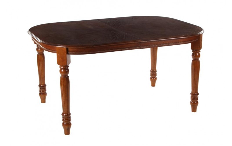 Стол раскладной, по форме является овальным, его столешница основывается на четырёх изящных резных ножках. Ширина стола равна 107 см, длина – 153 см., за счёт раскладных вставок его длина увеличивается до 198 см. Высота этой модели равна 77 см. Вес изделия равен 50, 83 кг., а объём – 0,28 м³. Цвет стола – тёмный орех. Стол малайзийского производства и выполнен из таких материалов как массив гевеи и МДФ, обладающих прекрасными характеристиками.