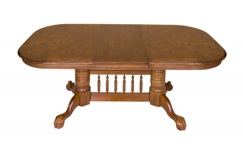 Стол имеет овальную форму и основывается на двух широких ножках, соединяющихся между собой перекладиной и разделяющихся к концу ещё на две ножки. Ширина стола равна 107 см., длина составляет 168 см., он раскладной, поэтому при раскладывании его длина достигает 214 см. Высота изделия равна 77 см. Вес – 63, 68 кг., объём – 0,33 м³. Цвет этой модели – дуб в красноту.