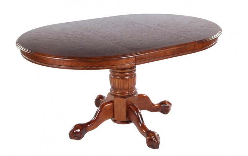 Стол имеет круглую форму и основывается на красивой резной ножке, которая выходит из центра и к концу разделяется ещё на четыре небольших ножки. Ширина и длина стола равны по 122 см., раскладываясь, за счёт удобного механизма, он может увеличиться в длину до 183 см. Высота изделия равна 77 см. Вес – 50,3 кг., а объём – 0,31 м³. Цвет этой модели – дуб в красноту.