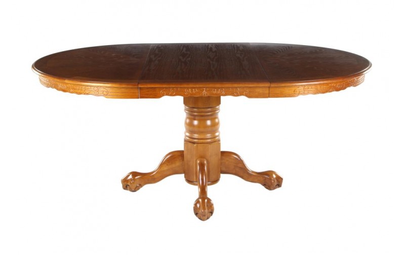 Стол имеет круглую форму и основывается на устойчивой резной ножке, разделяющейся к концу ещё на четыре небольших ножки. Ширина и длина стола равны по 122 см., он раскладной, поэтому при раскладывании его длина достигает 183 см. Высота изделия равна 77 см. Вес – 53, 19 кг., объём – 0,31 м³. Цвет этой модели – дуб.