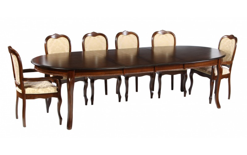 Имеет овальную форму, основывается на четырёх ножках. Вес стола равен 75 кг, а объём 0,45 м ³. Высота составляет 75 см. Ширина - 120 см., длина - 196 см., раскладываясь же он увеличивается в длине и может достигать 284 см. Цвет изделия - Tobacco или, что одно и тоже, темный орех.
