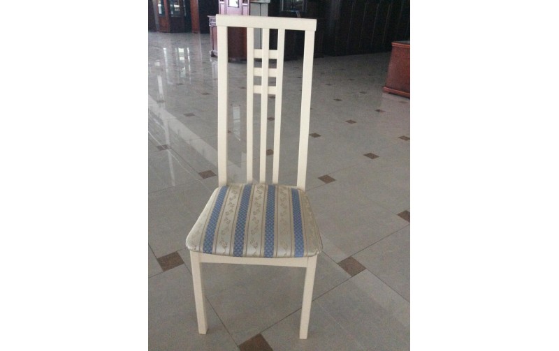 Эта модель стула имеет высоту равную 105 см., ширину – 43 см. и длину – 46 см. Вес изделия – 3,92 кг., а объём – 0,02 м³. Спинка стула имеет красивую резьбу, сидение обтянуто мягкой тканью, основан на четырёх устойчивых ножках. Цвет этой модели - белый антик (без патины).