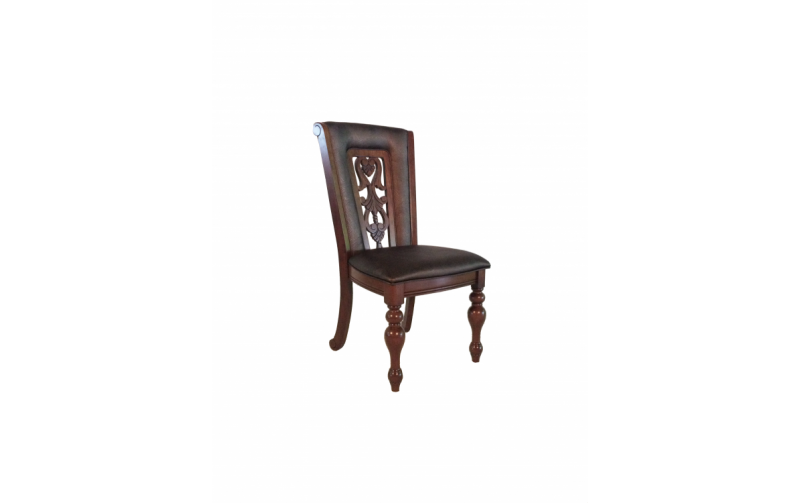 Высота данной модели стула составляет 105 см., ширина – 56 см., а длина – 59 см. Вес изделия равен 10 кг, а объём – 0,1 м³. Основан стул на четырёх ножках (сзади немного изогнуты, а спереди имеют красивую резьбу), сидение и спинка обиты мягкой экокожей. Цвет каркаса стула – Light Walnut, экокожи - чёрный. Поставляется в двух экземплярах на одну коробку.